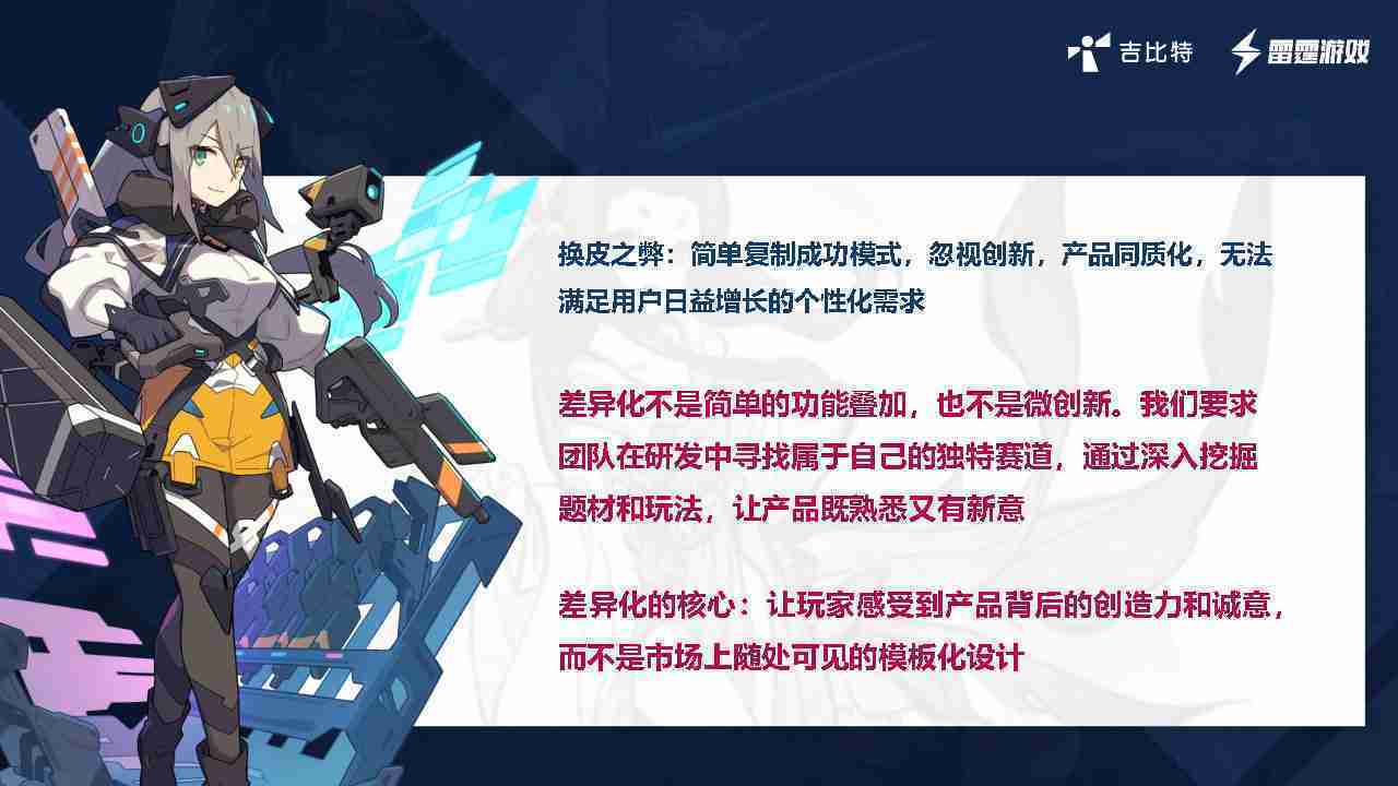 在我们内部是这么定义差异化的。。首先,,,差异化不是简单的功能叠加,,,更不是换皮。。。只是换皮,,,,产品无法提供有效的市场价值。。。。内部经常说差异化的产品不是为了迎合市场,,而是找到一个自己独特的表达方式,,,在研发中找到属于自己的细分赛道和独特赛道,,,,前提是需要对这个题材有足够的深入、、、挖掘,,,,对玩法有足够深入的理解,,,让产品看起来既熟悉又有新意。。