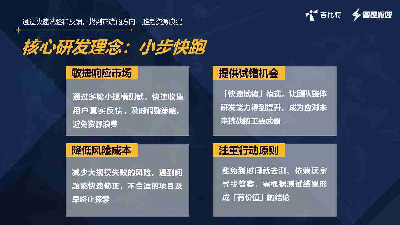 小步快跑不是找答案,,而是验证答案。。。我们之前有项目是这样的,,有些制作人会有几个方向觉得都可以做,,,但是不确定做哪一个,,,,会选择几个都做,,,,做完拿到市场跑,,,跑出哪一个更好,,,基于这个再做后续的研发和拓展。。。。但这种情况最容易出现一个问题,,,可能被玩家裹胁,,,玩家说这个点不错、、、那个点不错,,,到底听还是不听,,不听感觉是无视玩家的反馈,,,听的话,,,,可能自己没想清楚导致研发思路发生偏颇。。。所以针对这一点后面自己复盘整理,,,,发现制作人自己心里要有数,,,要做自己觉得好玩的,,,,而且明确知道这个东西是你想做的,,然后拿到市场验证这个答案是不是对的,,,,而不是拿一堆答案找哪一个答案更好。。。