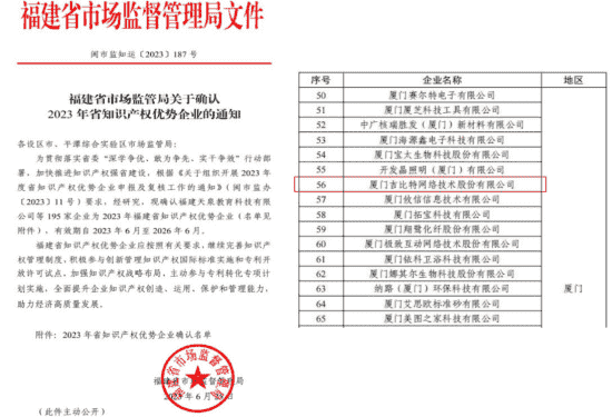 近日,,,福建省市场监督管理局公示了2023年福建省知识产权优势企业名单,,,厦门亚星管理网络技术股份有限公司(以下简称“亚星管理”或“公司”)榜上有名。。。。